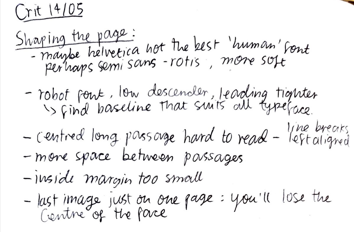 I used Metaflop to make my own robotic typeface; accentuating angular shapes, enlarging counters, and reducing contrast and weight. This seemed to work well, although someone suggested in a later crit that the descenders were too low and made the leading seem too tight. Then I had the task of finding a human font; I think I didn't spend enough time researching this, and thought Helvetica would do the trick. My tutor noted that Helvetica, a san serif, universal font perhaps isn't the most human font there is; and that I should look into a semi-sans such as Rotis, for a softer look. My argument was that I didn't want a typeface that would distract the reader from the custom robot font; I thought neutrality would be the best route. But are humans neutral? I think I wanted Ben to be the mediator between these two robotic polarities.