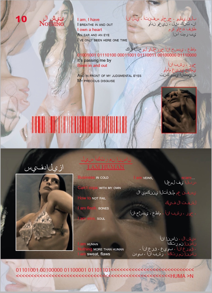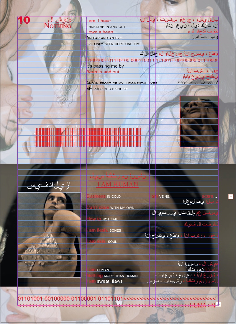 This project really helped learn the ropes of InDesign whilst exploring an unusual dynamic between format and content. Looking over the list of possible formats, passport intrigued me; a concise identification document with a purely functional system. I chose to pair this with one of my favourite artist, Sevdaliza's song 'Human'. It's abstract and existential tone fits quite interestingly with an ID format; with few lines it has a powerful impact, similarly to a passport. The visuals obviously stray from tradition; I chose to have a muted background consisting of multiple striking nudes of Sevdaliza; a raw portrayal of her humanity. The second page is much more unconventional, using darker imagery as a stark contrast, bringing an intensity to the piece. The ID photos are snapshots from her music video, showing dynamic poses as opposed to the formal passport photo. I chose to border these as they got lost within the busy background, and the red and white create an imposing look. Because of her Iranian decent, I chose to use the format of an Iranian passport; using a mixture of English and Persian text as a nice dialogue between the two cultures. Following the layout and typography of an Iranian passport, I mixed regular Arial Unicode with small caps, and Times New Roman regular for the Persian text. Details like the barcode, number in the corner and number codes really help build the impression of a passport. I also translated some of the verses into binary code and peppered this amongst the text; an observation on how our identities/humanity are condensed into data within a passport.